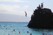 マウイ島南東の沖にある三日月形の小さな無人島です。島は、海洋生物保護区に指定されているため、上陸・生き物の捕獲と餌付け・自然物の持ち出しは禁止されています。しかし、透明度の高い水の中でサンゴ礁やカラフルな熱帯魚に出会える上、冬にはホエール・ウォッチングが楽しめ場所として有名です。モロニキ島へは、マウイ島のマアラエア湾またはラハイナ港から船で約1時間。