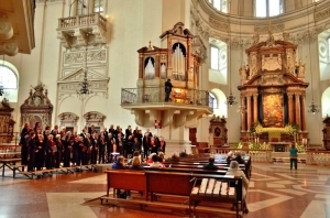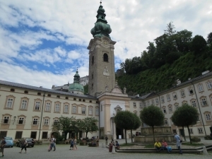 ザルツブルク大聖堂は、ヨーロッパ有数の歴史を誇る大聖堂です。司教聖ヴィルギリウスが744年にロマネスク様式の聖堂を建てたのが最初で、1181~1200年ころにかけて後期ロマネスク様式に改築され、1628年に、イタリア出身の建築家サンティーノ・ソラーリオによりイタリアバロック様式の聖堂に建て直され、さらに1959年の改修を経て、今日に至っています。ドーム尾ある大理石の2つの塔をはさんだファザード、多数の彫刻によって装飾され、内装は光の効果をふんだんに利用しており、イタリアのバロック様式を取り入れた美しい建築で知られています。