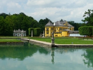 ヘルブルン宮殿は17世紀に大司教マルクス シティクスがイタリア芸術家とサンティノ ソラーリに造らせた夏離宮です。至るところに水の仕掛けがあり、庭の石造りのテーブルから定期的に水が噴き出す仕掛けや噴水により王冠を浮かび上がらせる「王冠の噴水」などで有名です。かつて大司教はこの宮殿に客を招き、宴もたけなわになると水を降らせて客がびしょ濡れになるのを楽しんでいたといわれています。1613年から1615年にかけて改築され、5つの水力機械、256体の木偶を備えた機械劇場があります。