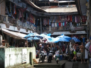 ウブド王宮の正面、まさにウブドの中心に位置する市場です。早朝は地元民で賑わう食品市場、日中は観光客向けのお土産スポットとして機能しています。密集して並ぶお土産屋さんでは、アクセサリー、アタ製品、バッグ、陶器、サロン(腰布)などの衣料品、宗教道具、絵画、スパイスなどなど、だいたいのバリ雑貨はこちらで手に入るといっても過言ではありません。ただ価格表示がないことがほとんどで、購入は交渉制です。