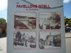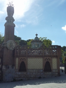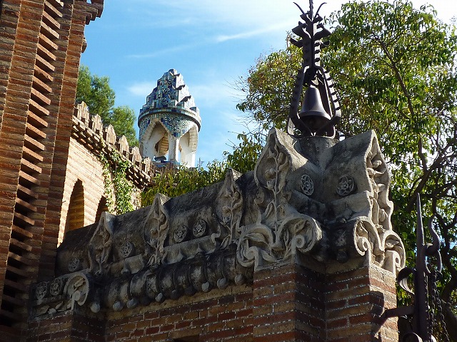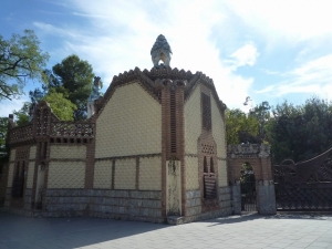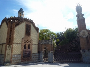 実業家のエウセビ・グエルはバルセロナに家族と休日を過ごす家を作ろうと、後に数々の仕事を依頼することになるアントニ・ガウディに初めて仕事を任せました。1884‐1887年に行われたこのプロジェクトでガウディは、庭を見直した後整備し、管理人の家や厩舎にする目的で門衛所を2つ建設しました。門衛所はレンガ、タイルを用いた幾何学的なデザインをしており、塔の上は植物をモチーフにしたもので飾られています。建物はイスラム教とキリスト教建築を融合させたムデハル様式を採用しています。
