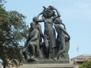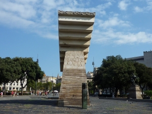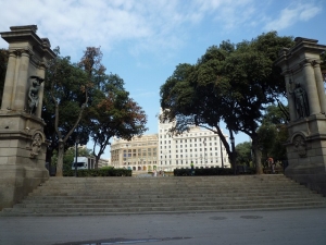 フランセスク・マシア記念碑の裏側からの眺め。後ろは交差点になっていて、見えている建物の間からランブラス通りが始まります。