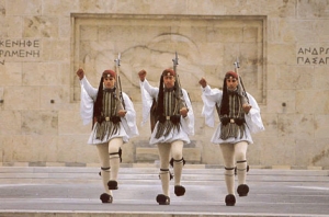 無名戦士の墓の前では、毎週日曜の11時前後に衛兵の交代式が行われます。ギリシャの伝統衣装エウゾナスを身に着けた兵士が足を高く上げて歩く姿はとても見ごたえがあります。