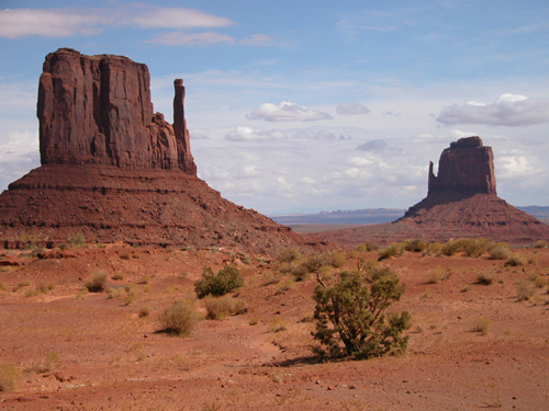 まずはここから。163号線からナバホ・銀座(日本人の添乗員がつけた、工芸品等の出店がたくさん並んでいるところ)に入りモニュメント・バレー・トライバル・パークへ。まずビジター・センターに着いて車を降り、崖っぷちへ向かうと、目の前にががーんと、モニュメント・バレーを代表する光景が飛び込んでくる。ビジターセンターの駐車場にはナバホ人が各々やっている4輪ツアーが待機しているので希望者はここで車を乗り換えてツアーに乗るのも良い。ビジターセンター内には案内他、この近辺で採掘された恐竜ティラノザウルスが残した足跡の化石も展示されている。ビジターセンターとビジターセンターからバレーロードをちょっと降りたところからはミトンズ・ビュートが目の前に見える。まるで右手と左手の手袋(ミトン)が置かれているかのような景色でコマーシャル等で良く使用される。