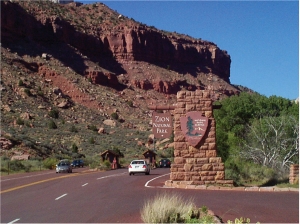 UT-9を約30~35分川沿いを道なりに進むと、ザイオン国立公園・南入口に到着。すでにこの場所からでもザイオンの巨岩を見ることが出来る