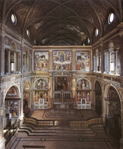 1504年から同名の僧院に建て加えられたサンマウリツィオ教会はまさにミラノの秘められた宝物のひとつ。内壁は、メロッツォ・ダ・フォルリ、ベルナルディノ・ルイーニや、カラヴァッジョの師匠でもあるシモーネ・ぺテルツァーノなどをはじめに、イタリアのルネッサンスを代表するアーティストたちが描いたフレスコ画でいっぱいになっていることからミラノのシスティーナ礼拝堂とも呼ばれています。