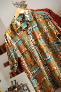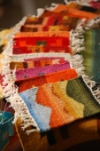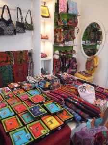 エントランスはギャラリーをイメージして、アートの街バランコらしくアーティスト達の作品を集めています。アルパカ製のタペストリーや、再生紙と織物を使ったフォトスタンドなどが揃います。さらに買い物客に人気の真っ赤なソファーが印象的です。入ってすぐ右はテキスタイルを扱っていて、工房で作ったプリント布製品や、肌触り抜群のピーマコットンシャツやTシャツなど、お店のオリジナル商品がズラリと並びます。