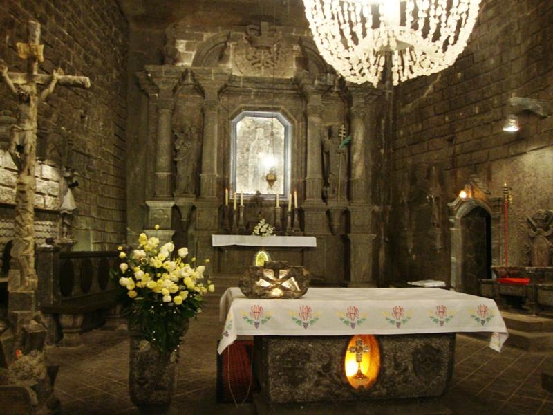 ヴィエリチカ岩塩坑の 深さ約100mのところには一番の見どころである見事な装飾を施された聖キンガ礼拝堂があります。磨きぬかれた階段や床、きらきらと輝くシャンデリアのあたかもガラスの結晶に見える飾りの一つ一つ、中央の祭壇、壁に彫られたレリーフにいたるまですべてが岩塩でできています!