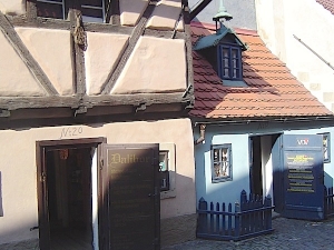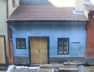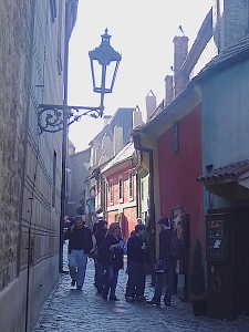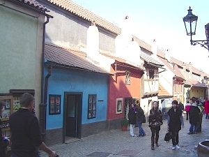 プラハ城の敷地内にある黄金小路。プラは城の東門から北側の斜面を下って行ったところにあるります。この名前は、16世紀に皇帝ルドルフ2世が錬金術師をこの道に住まわせていた事に由来すると言われていますが、実際は衛兵たちが住んでいた家々が並ぶ一角だったようです。現在はお土産やさん画の気を連ね、またその内の1つにプラハが生んだ作家、フランツ・カフカが半年間住んでいた家もあり、年中を通して観光客で華めいています。