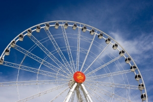 ■マリーナ地区にそびえる世界最大級の観覧車、シンガポール・フライヤー。28人乗りのカプセルが地上165メートルまで上がり、約30分で一周し、シンガポールを見渡すことができる。カプセルの大きさから、室内でハイティ、ディナー、さらには結婚式までできてしまうという