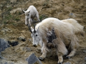 白い体毛に覆われ、長い黒い角があるマウンテン・ゴート、体長140から190cm、肩高90~114cm、体重65~135kg。カナダのロッキー山脈周辺とブリティッシュ・コロンビアの山岳地帯に生息しています。 (Photo:Pixabay by werner22brigitte)