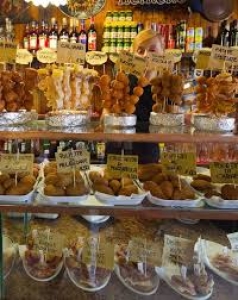 街のいたるところに点在するバカロ(Bacaro)は豊富な種類のグラスワインと惣菜がいただける立ち飲みワインバーともいえよう。エノテカに比べおつまみ程度に気軽に立ち寄って食事が出来る地元の人に親しまれたコミュニケーションの場でもある。かつてサンマルコ広場にワイン販売者が樽を持ちいれ、グラスワインを売っていたことからこのバカロのストーリーが誕生し、名称はワインの神”バッカス”から由来する。”オンブラ(陰)”と呼ばれるグラスはその当時太陽からワインを守るためサンマルコの鐘楼の陰を追っていたことから。